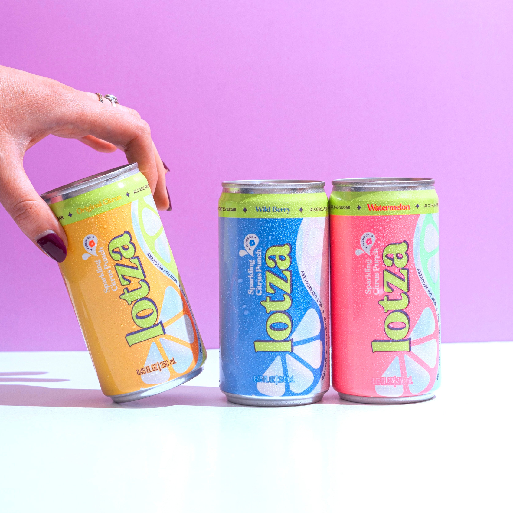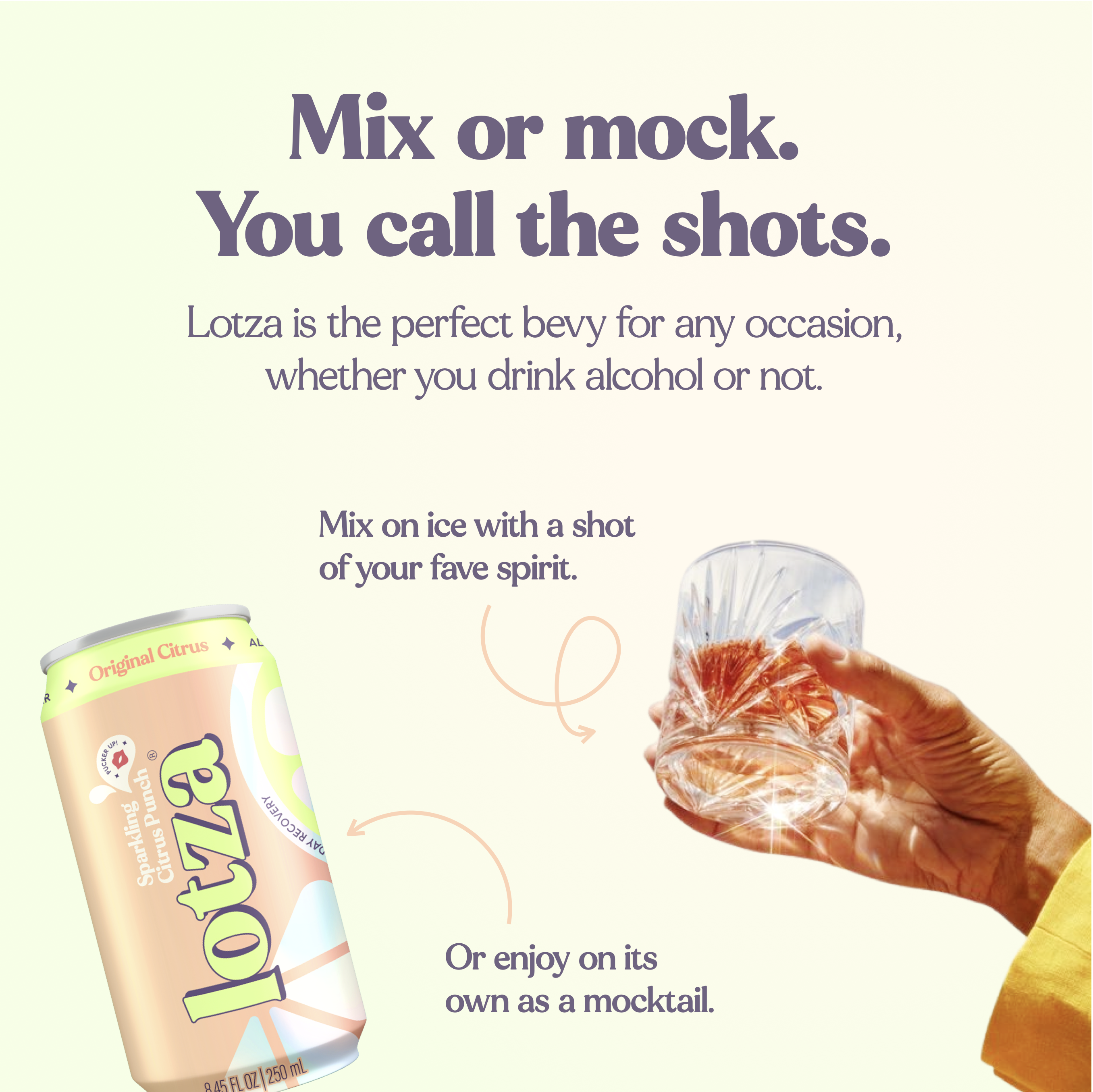 Vodka, tequila, gin, rum, whiskey—With Lotza’s delicious citrus base, she plays well with literally everything. Just add ice & friends. Or skip the booze; she's independent like that.